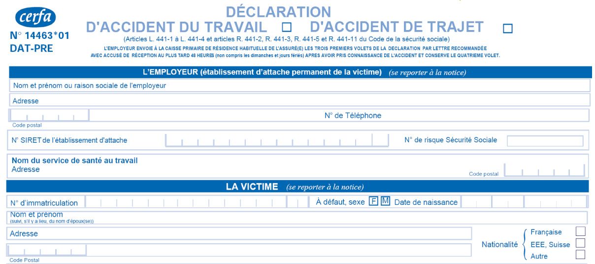 L'employeur doit déclarer tout accident du travail, de mission ou de trajet.